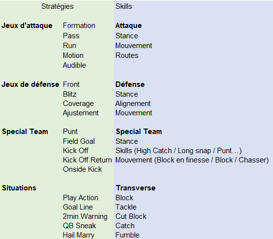 Voici une liste de ce qu’on retrouve forcément dans une équipe de football américain. Vous l’avez compris il y a un réel lien entre la stratégie mise en place et les compétences à développer :