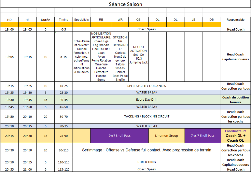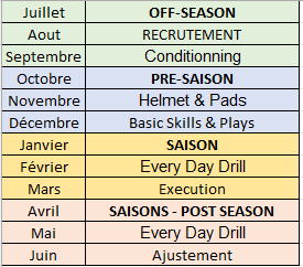 Vous l’avez compris car c’est logique, je ne peux dire que je suis entraineur de football américain sans planifier ma saison et sans en faire part à mes joueurs. Chaque trimestre doit être voué à un objectif tout en répétant les bases